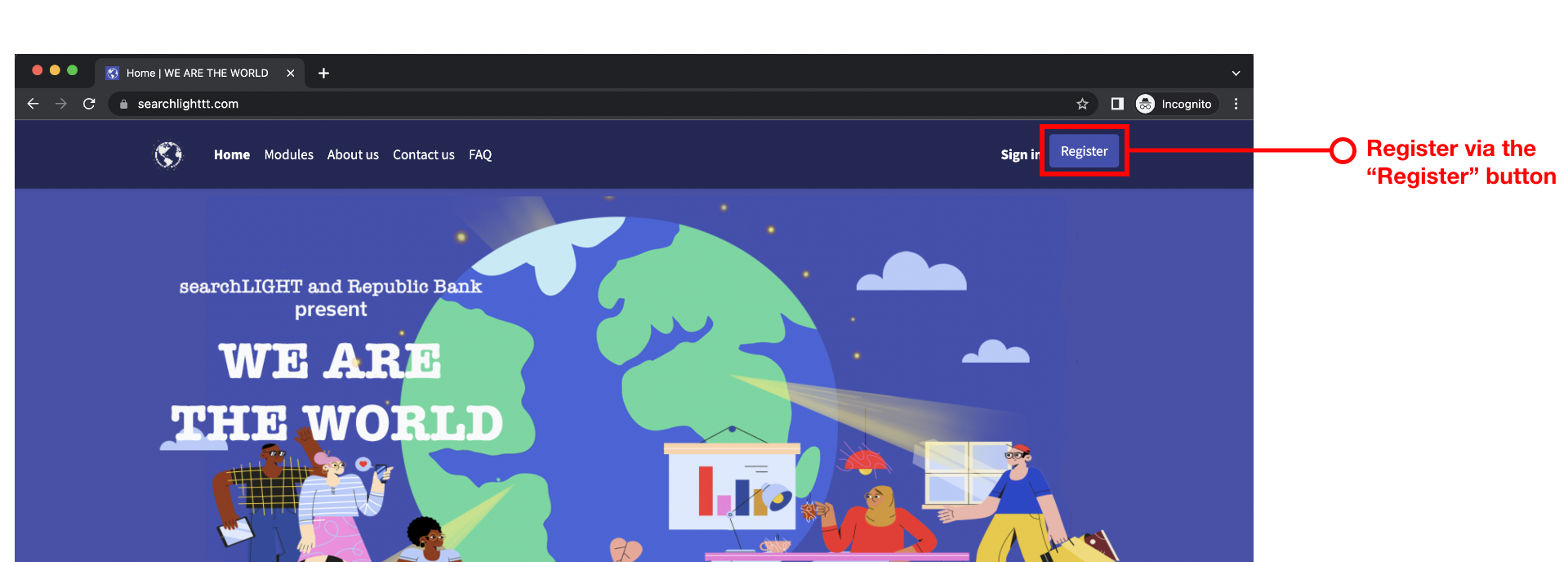 After visiting the WE ARE THE WORLD website, Click on the "Register" button to begin the registration process!