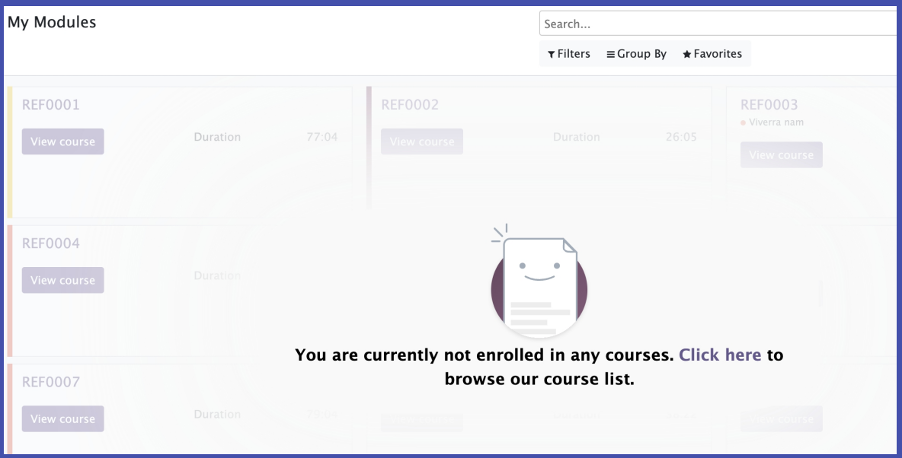 You will be forwarded to the participant "dashboard" If you haven't purchased any courses, this page will be empty. Click on "Click here" to browse the courses for sale