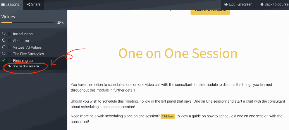 For the Virtues module, you have the option to schedule a one on one video call with the consultant to further discuss everything you've learned in throughout the module.